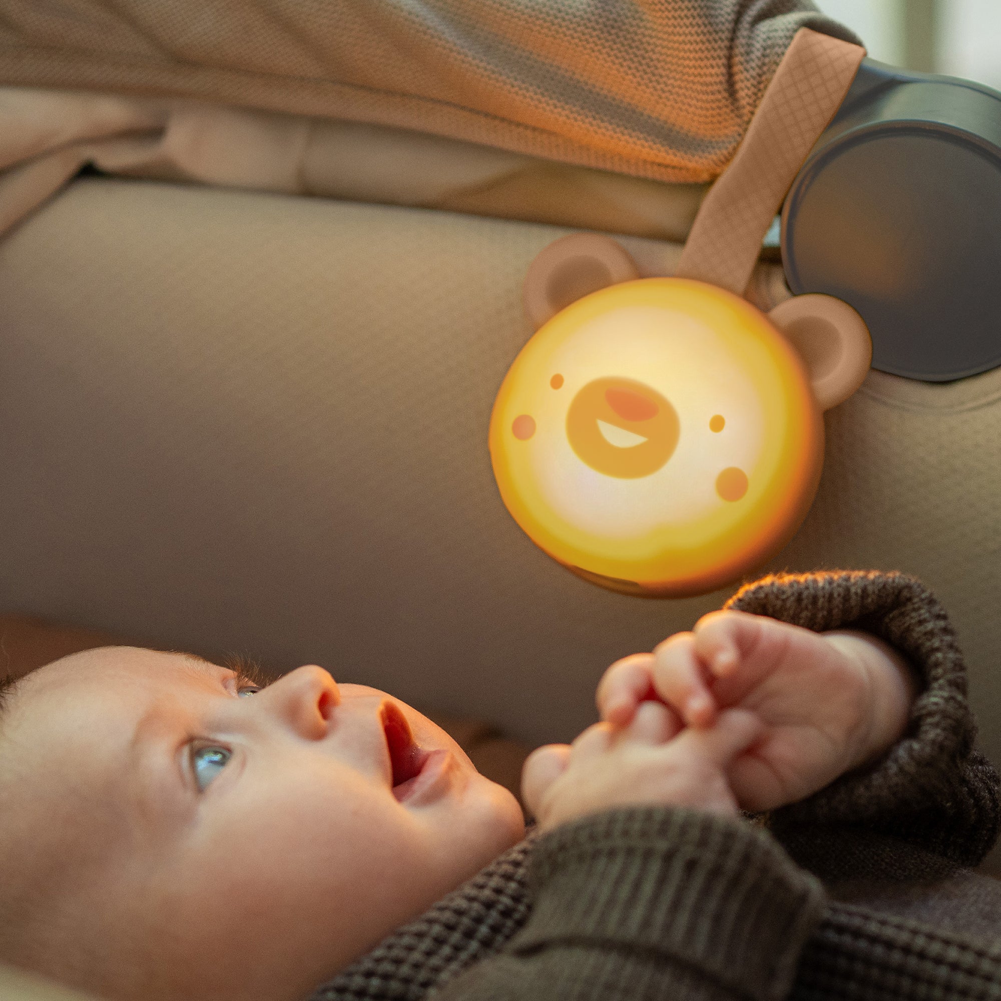 Silicon bear-shaped unit combines 30 minutes of calming melodies, a gentle glowing light, and a smart cry sensor for automatic comfort. -